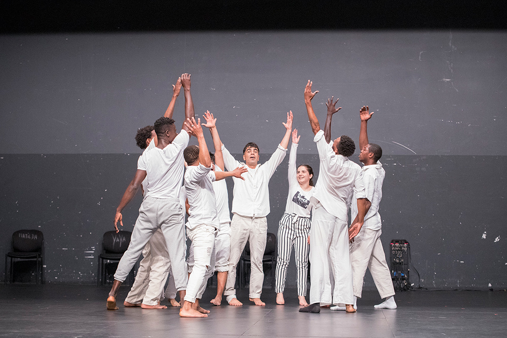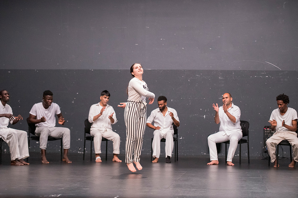 Régine Chopinot organise une partition en danse, rythme et parole pour une vingtaine de jeunes gens en apprentissage de la langue française au C.A.A.A. de Toulon.