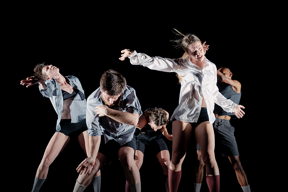 Ce qui nous traverse milite pour un retour en avant, en réinterrogeant notre rapport aux corps, à la relation physique, à l’espace commun. Au plateau, six interprètes aux morphologies bien distinctes sont emmenés dans une vague de mouvements rapides ; pensée comme un rite. L’écriture métronomique, dissociée, répétitive, engage les danseur·ses dans une forme de transe contenue. Cette contrainte entraine sous nos yeux, le corps des six protagonistes vers une transformation. Ils s’incarnent, certains ralentissent, traversés par des pulsions de vie, comme électrisés par l’instant. D’autres attaquent le mouvement, comme un pianiste se jette tout entier sur une touche, avec ferveur et frénésie. L’écriture joue avec les ruptures, le rythme parfois extrêmement lent, en résistance, comme pour laisser voir à travers la peau. Le courant passe, tous sont liés, de manière invisible mais réelle. Ils partagent le même espace, le même monde.