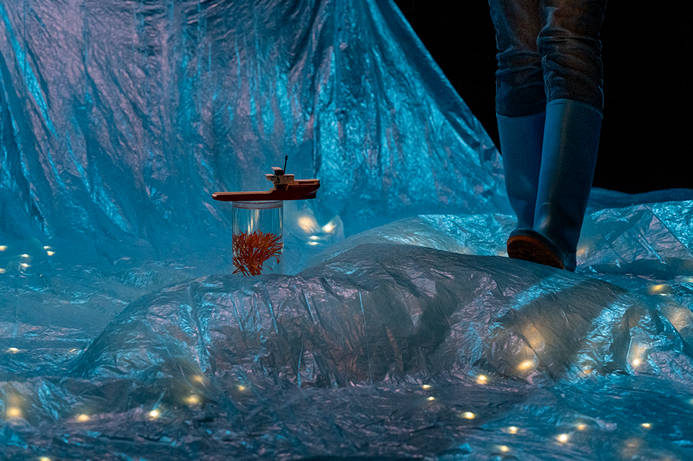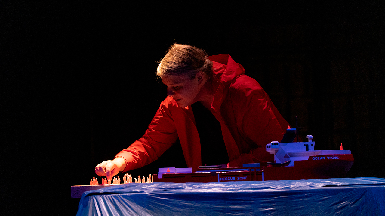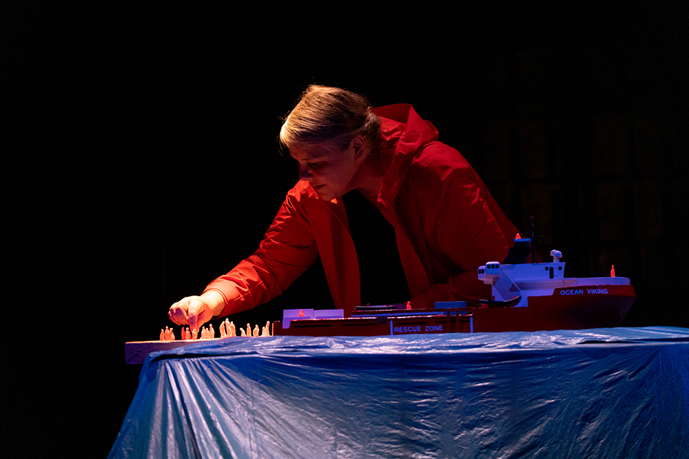 Anaïs Allais Benbouali s’est plongée dans la lecture et l’écoute de nombreux témoignages de rescapé·es secouru·es par l’équipe de SOS Méditerranée à bord de l’Ocean Viking, leur navire ambulance. Touchée par les récits de rescapé·es, elle a cherché les mots justes pour les transmettre aux enfants. Sur scène, elle convoque deux personnages. Il y a d’abord la mer qui prend corps. Elle s’adresse à nous, s’indigne de l’indifférence des humains et gronde parfois. Au loin, l’Ocean Viking secourt celles et ceux qui n’ont eu d’autre choix que de monter à bord d’esquifs, des bateaux de fortune.