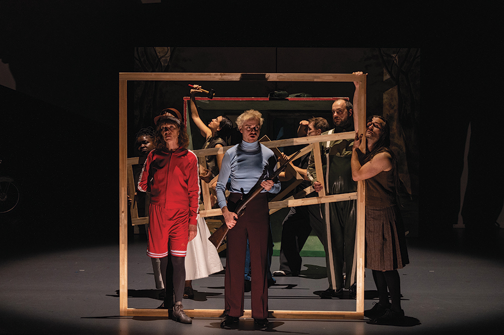 Au milieu d’un atelier de peintre, clin d’œil à sa seconde passion, dix comédien·nes et deux musicien·nes nous entraînent en exploration, échangeant contrepèteries et calembours, taquinant la grammaire, détricotant les anglicismes. Autant de jeux de mots qui interrogent la langue, ce qu’elle produit en nous et ce que nous en faisons.